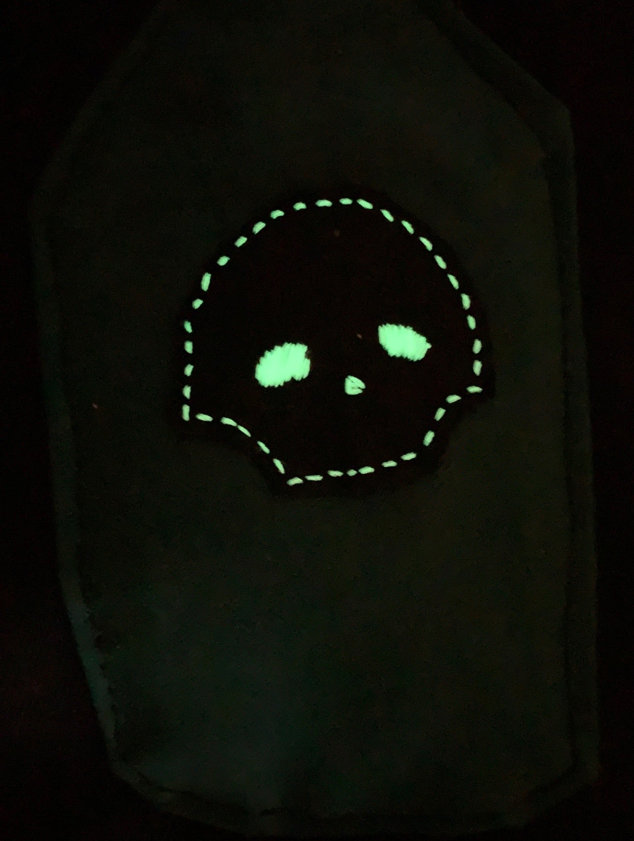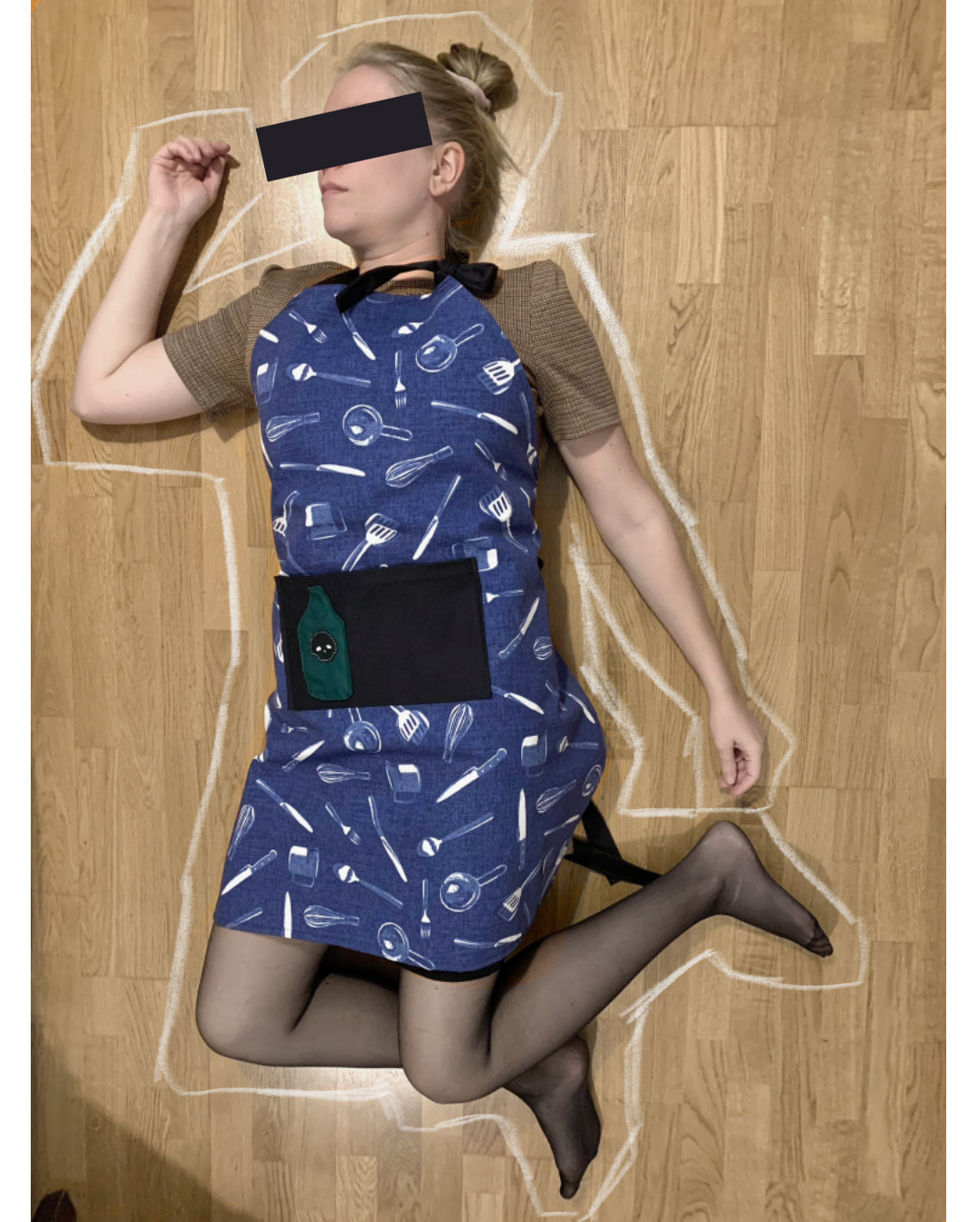 Esiliinan taskua somistaa pieni myrkkypullo, jossa on pimeässä hohtavalla langalla käsin kirjailtu pääkallo. Taskussa on hyvä säilyttää salainen resepti tai yrttipussi.