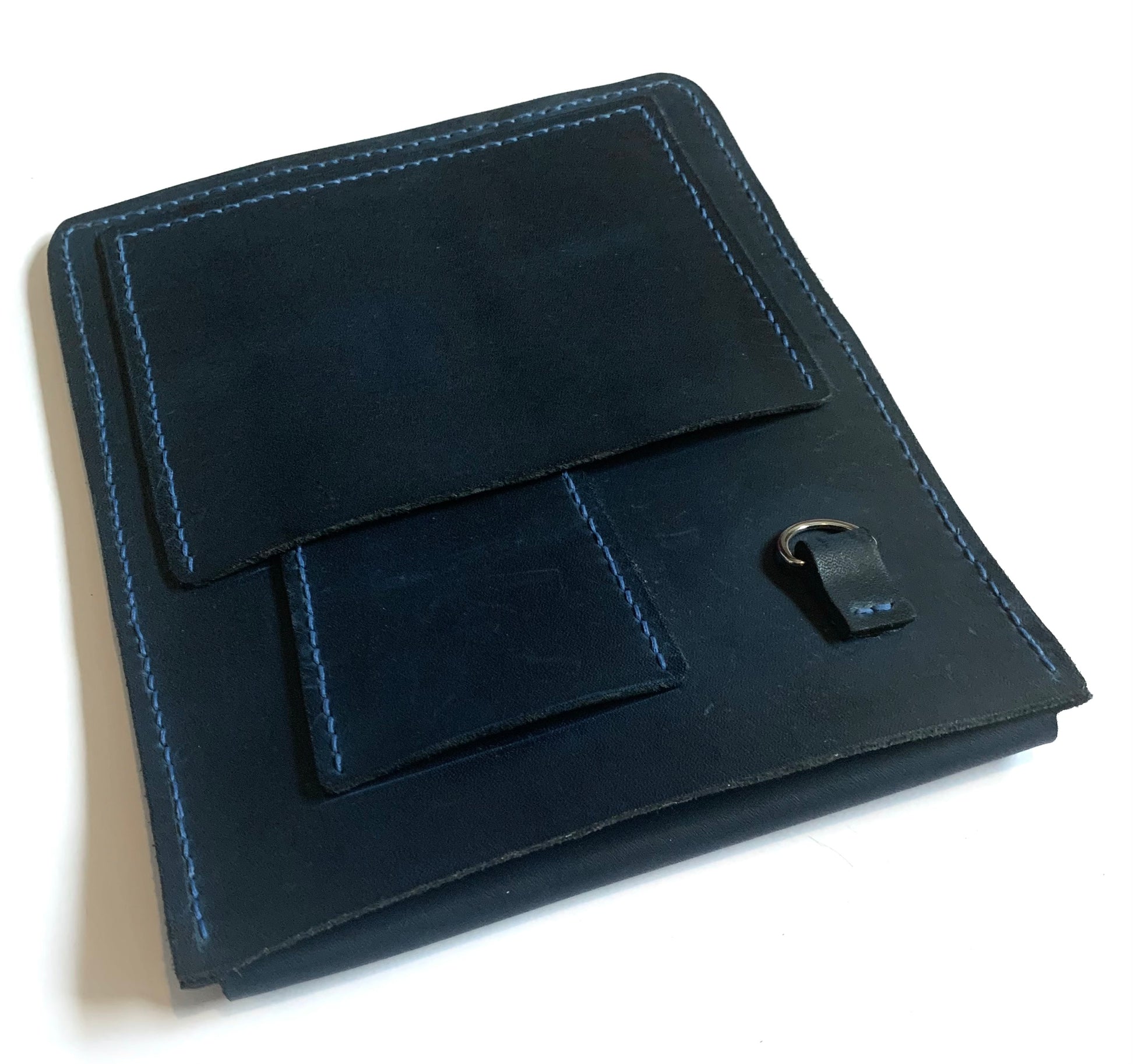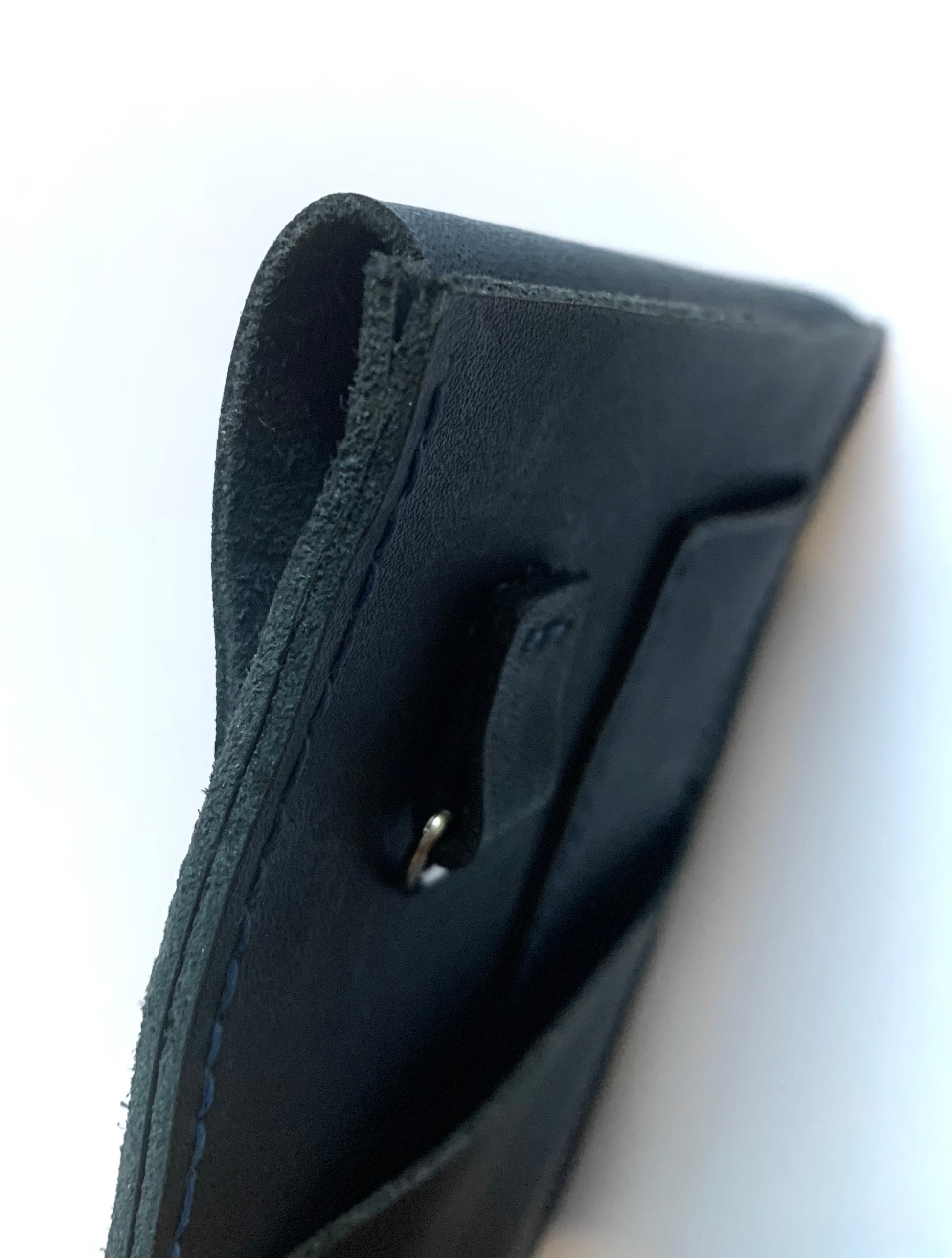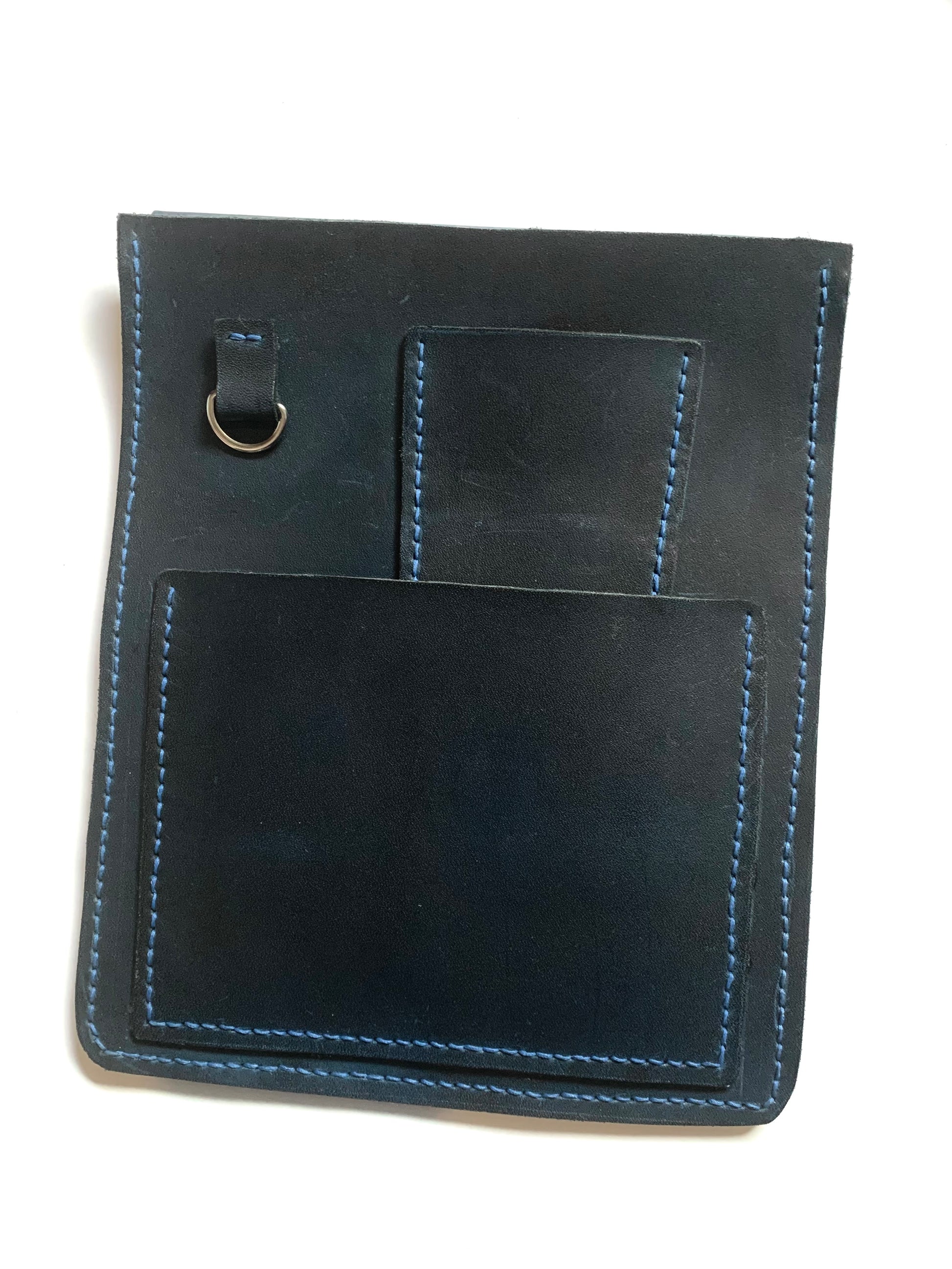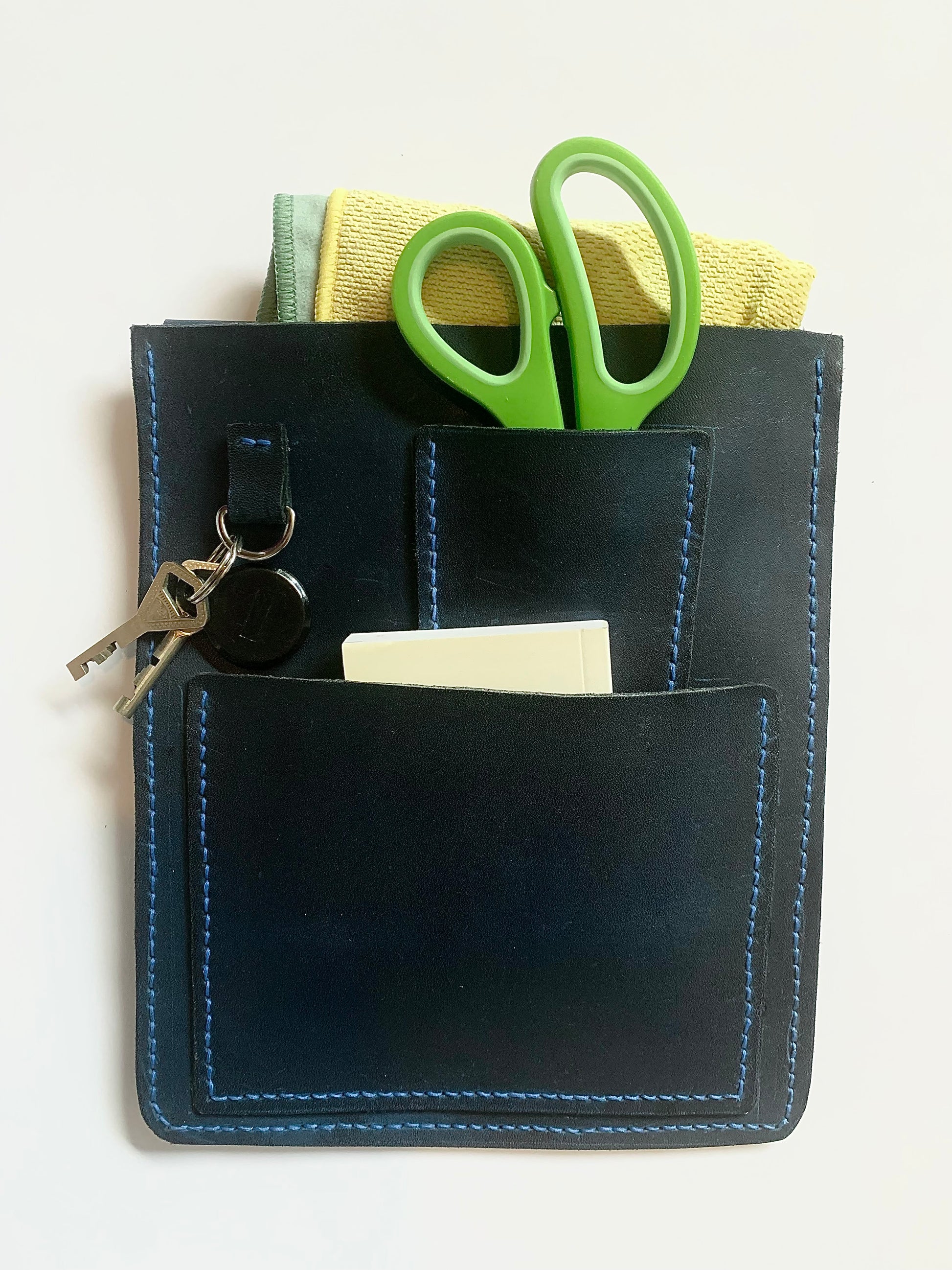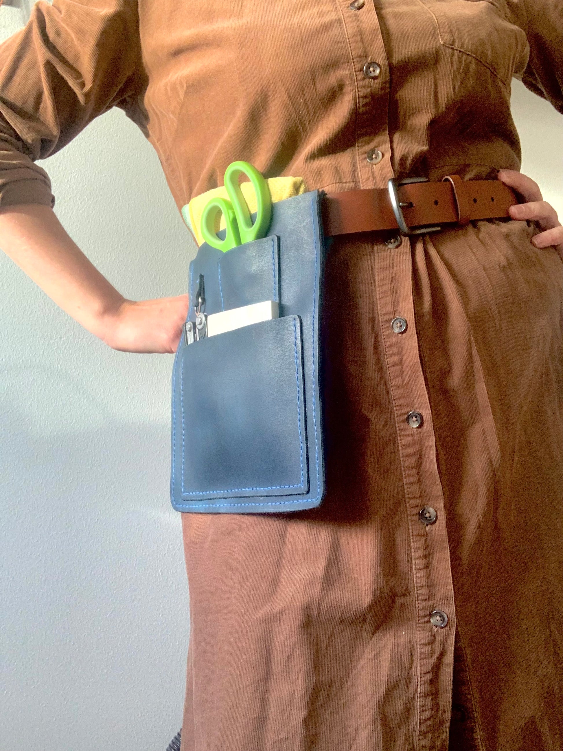 Paksusta ylijäämänahasta valmistettu työkalupussi on tukeva ja tyylikäs. Pussi pujotetaan vyöhön (vyön max. leveys 3,5 cm).
