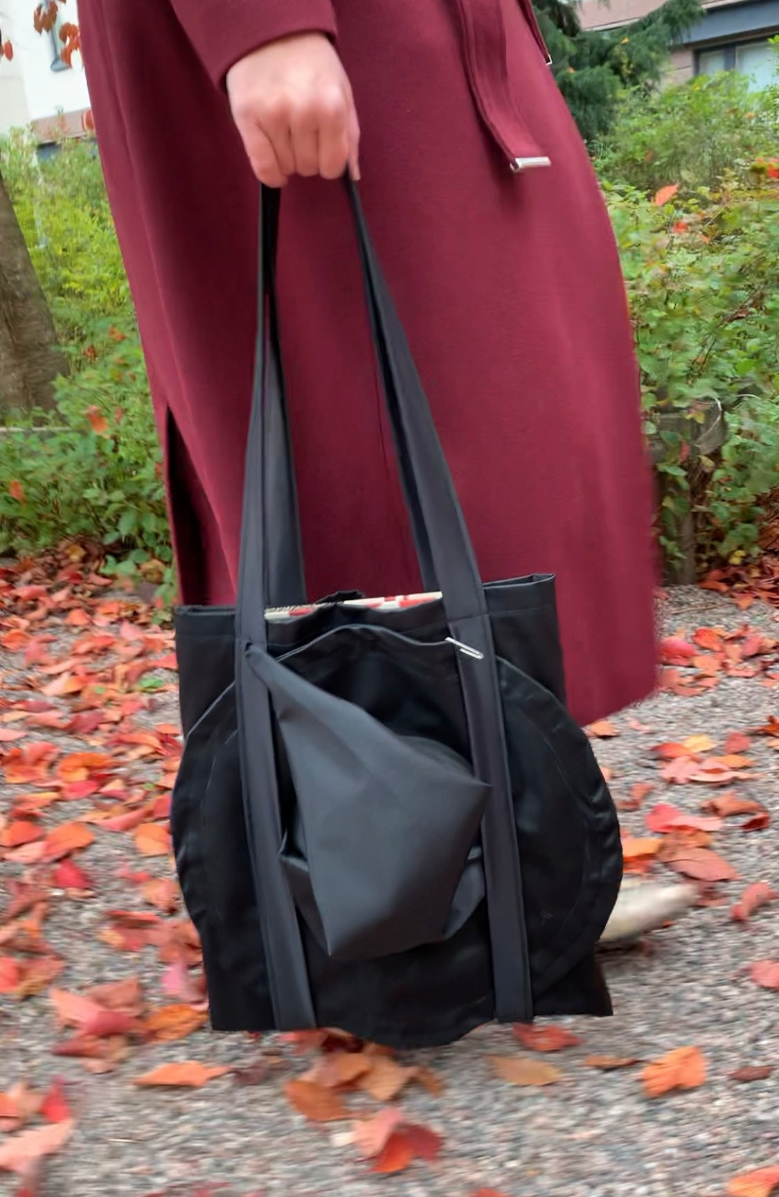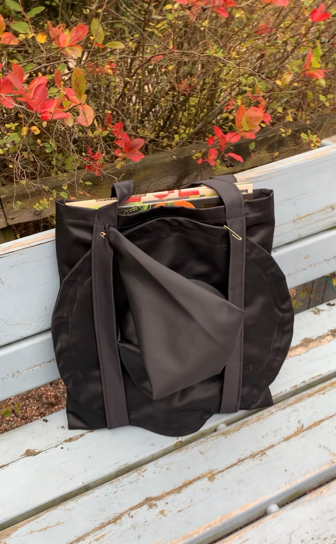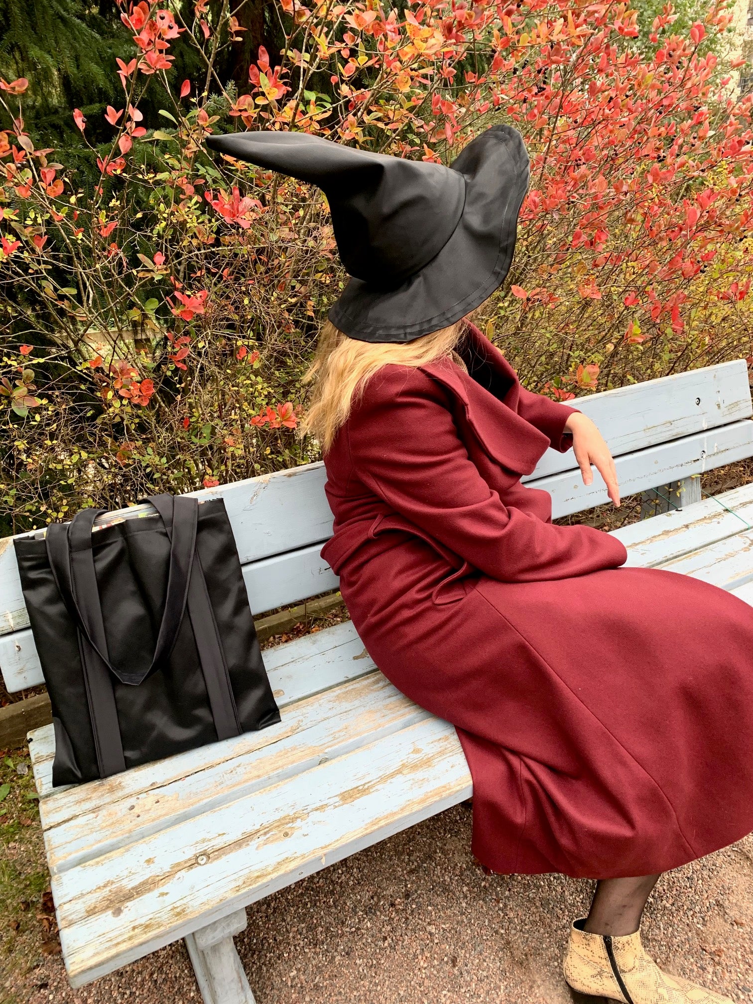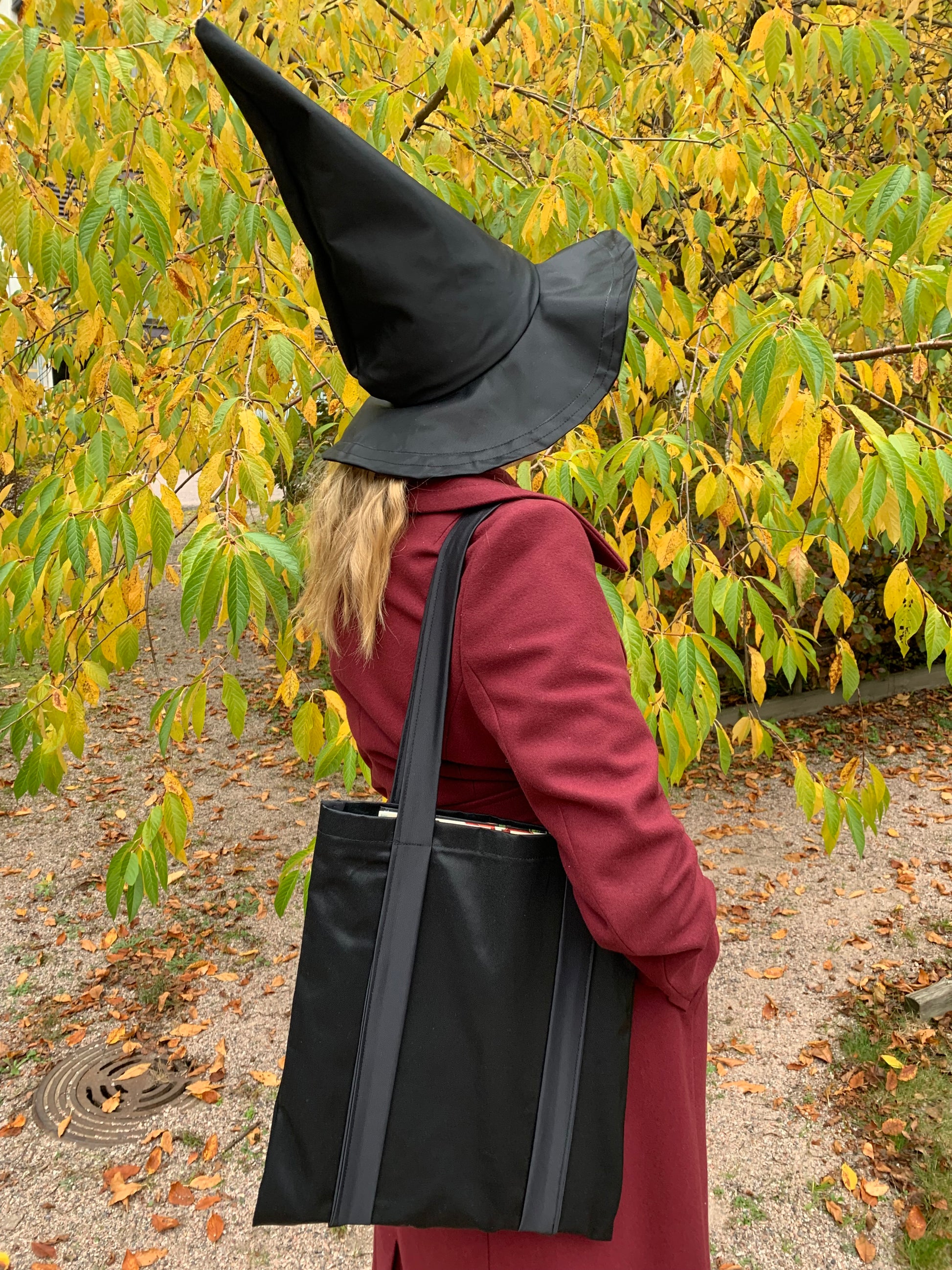 Tukevasta puuvillasekoitekankaasta valmistettu kassi, johon on kahdella hakaneulalla kiinnitetty noidan hattu. Hatun voi helposti irrottaa ja liittää taas kassiin somisteeksi. Kassi on tilava ja kevyt kantaa. Kassi ja hattu ovat mustat. Hatun reunassa ei ole rautalankaa, mutta se tästä huolimatta pitää hyvin muotonsa.
