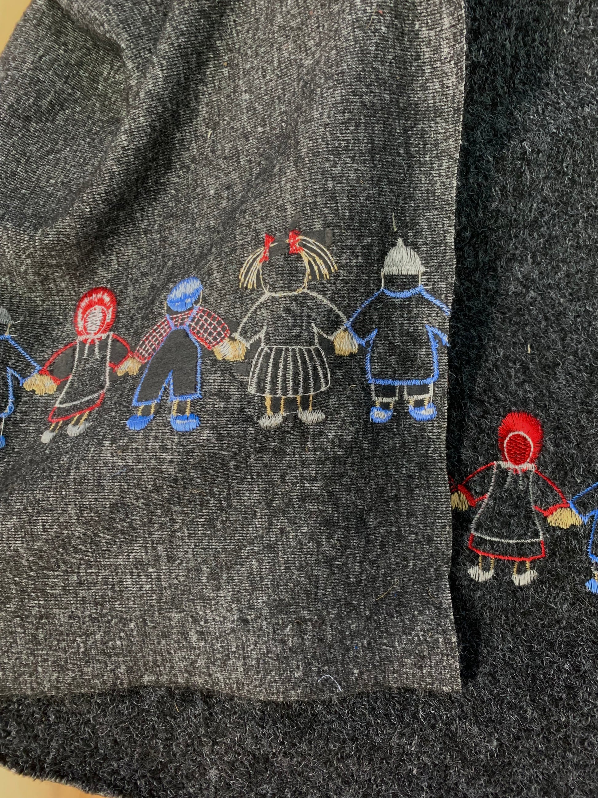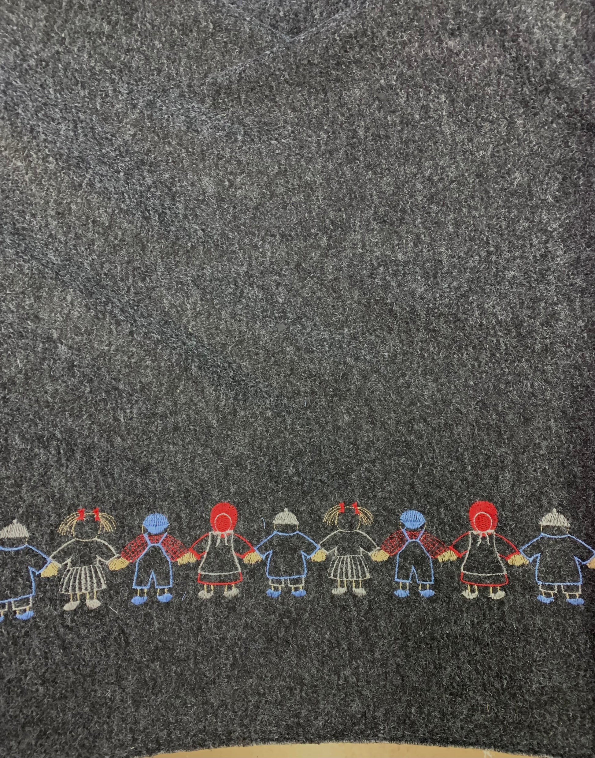 Meleerattu pörröneuloskangas, jonka alalaidassa (reunasta 13cm) on brodeerattu lapsia. Lasten korkeus on noin 8-9 cm.