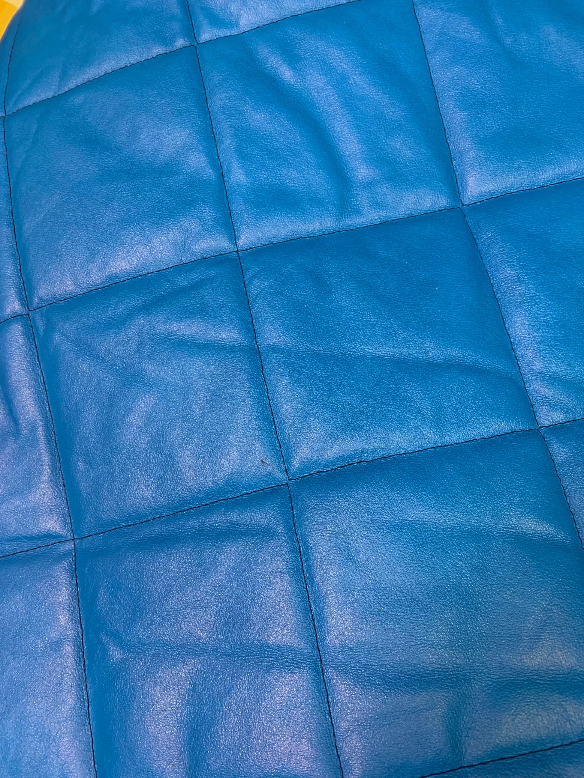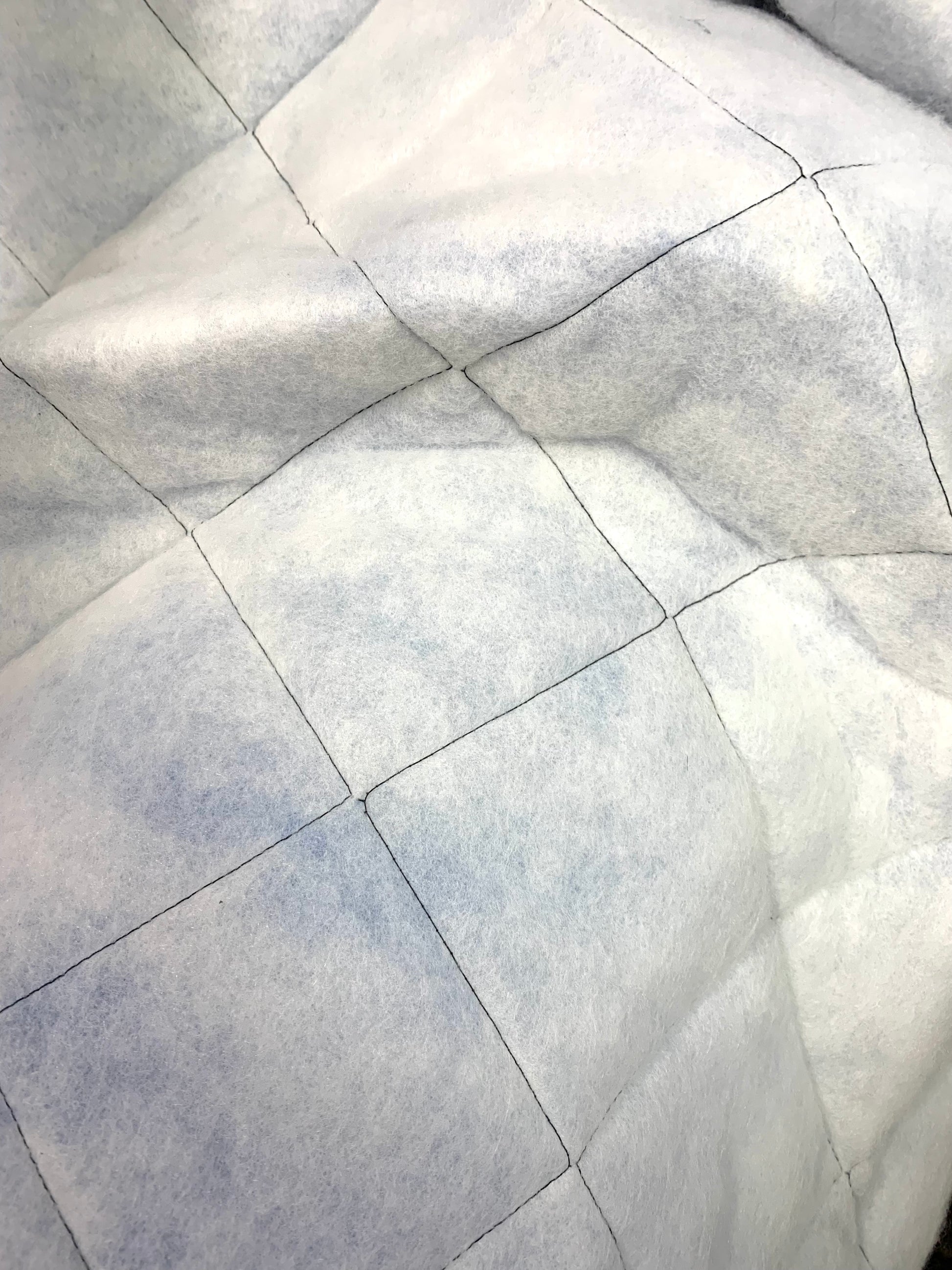 Tekonahkainen tikkikangas, jossa ohut vanu. Neliöiden koko on 11x11 cm.